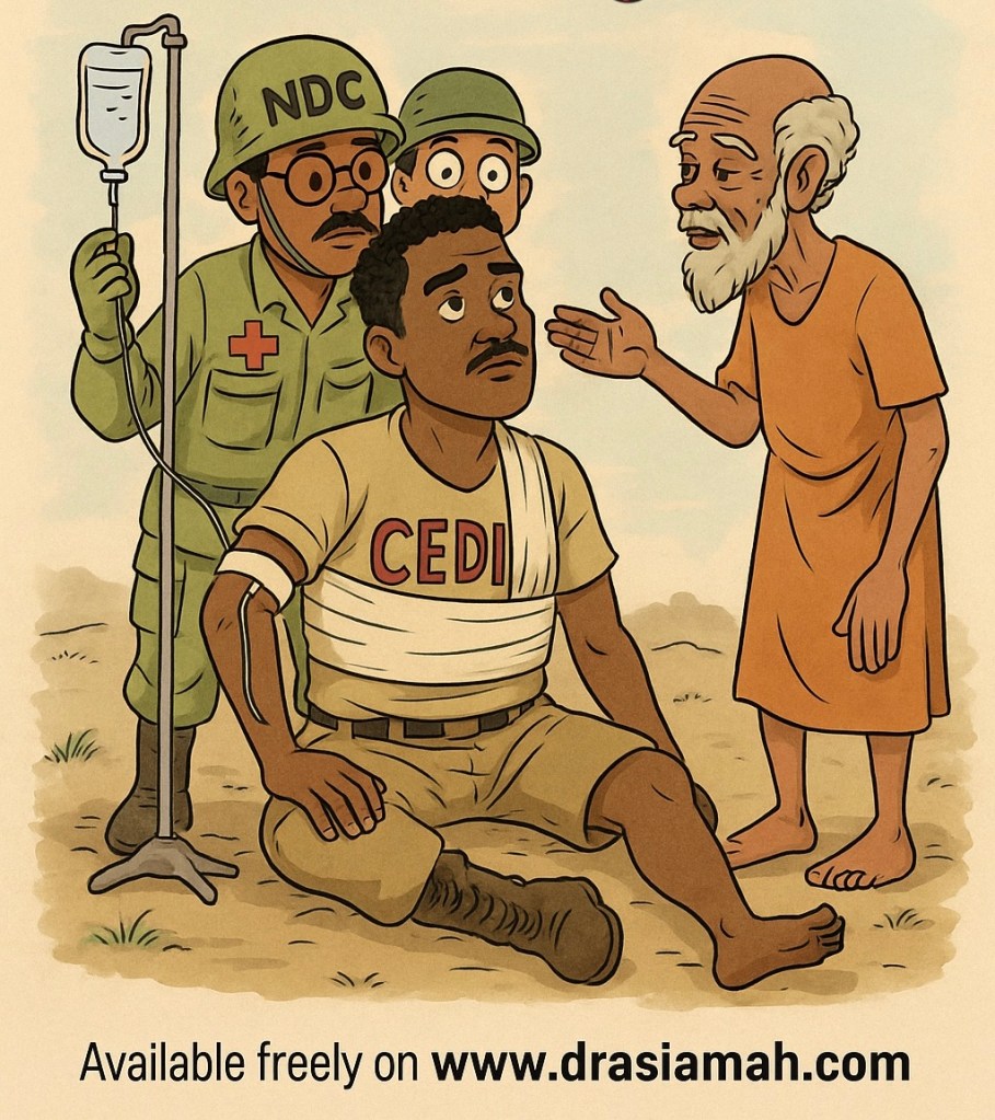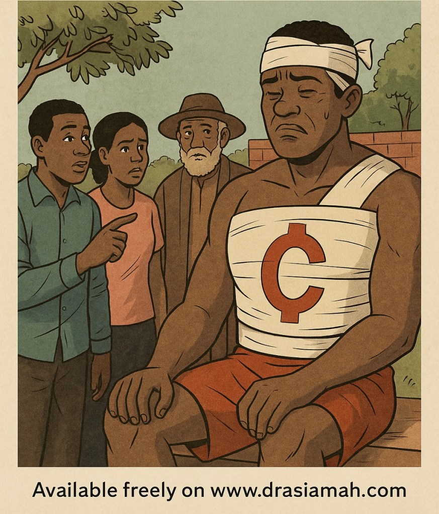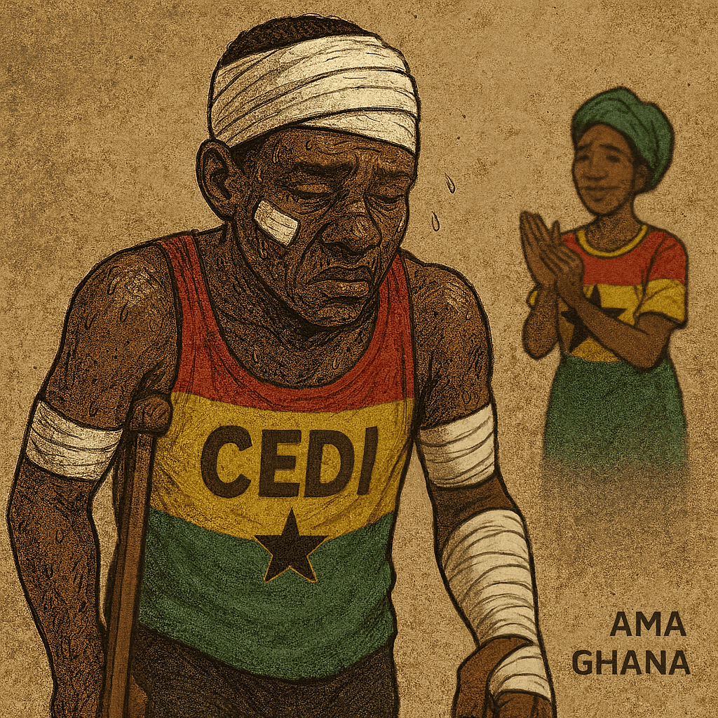 - Cedi sits with patched clothes, tired but still proud. He has survived IMF clinics, market beatings, and political abuse, yet he keeps limping forward.